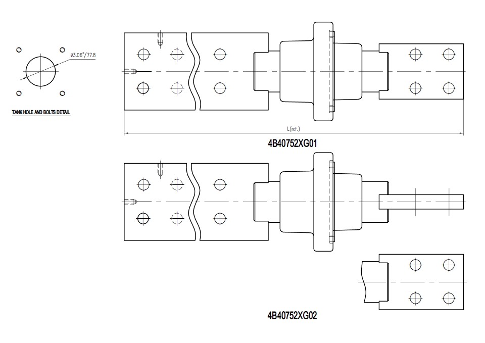 Electrical conductivity: 101% IACS(20℃) Current Rating: 4515A Voltage Rating: 2.5kV BIL45kV Application temperature: -40~130℃ Tank hole diameter: ¢77.8. 4-bolts assembly. |