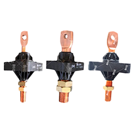 The molded integral bushings are dimensionally interchangeable with the majority of similar bushings available on the market. These interchangeable dimensions include: the bolt circle for the integral mounting flange, the tank wall hole size, the conductor stud diameter, the internal connecting of one hole spade and the external threaded size.